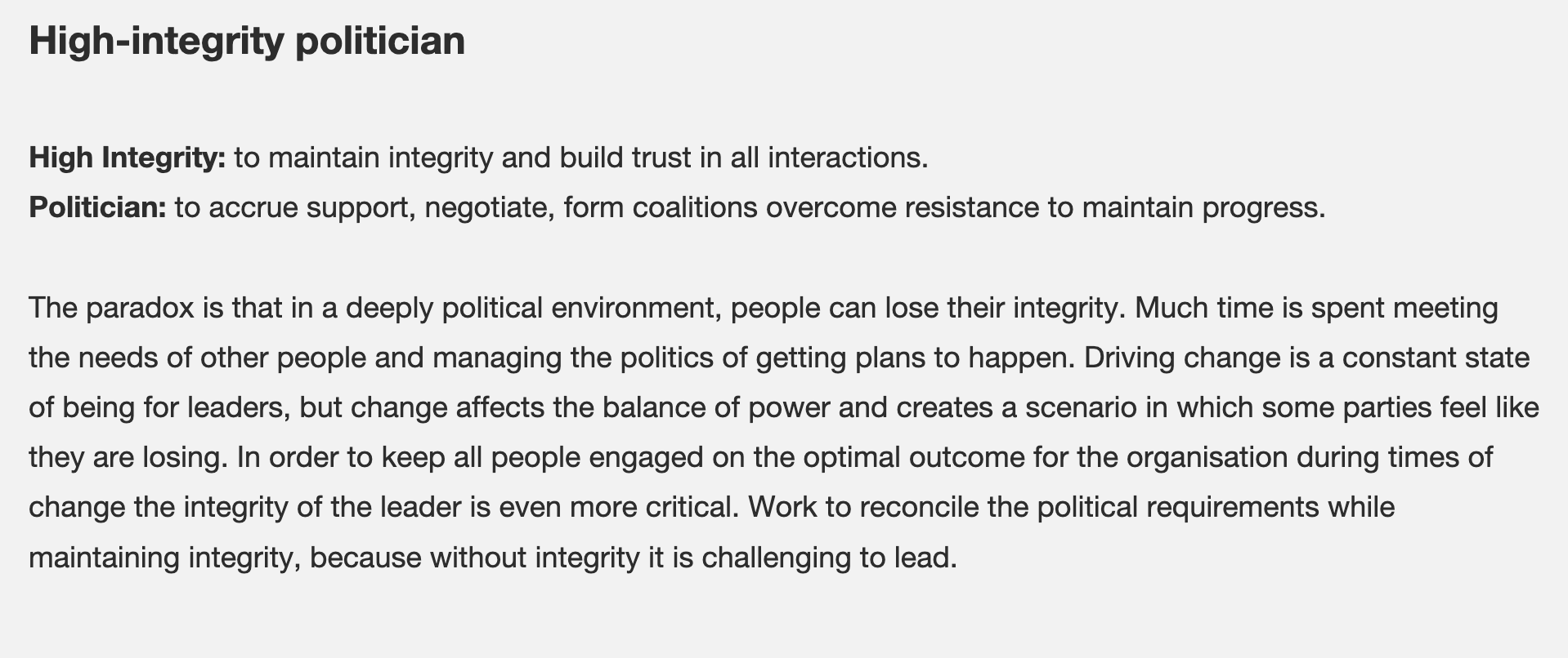 Additionally, a reputation for integrity is itself a political asset, making it easier for people to follow one’s lead.